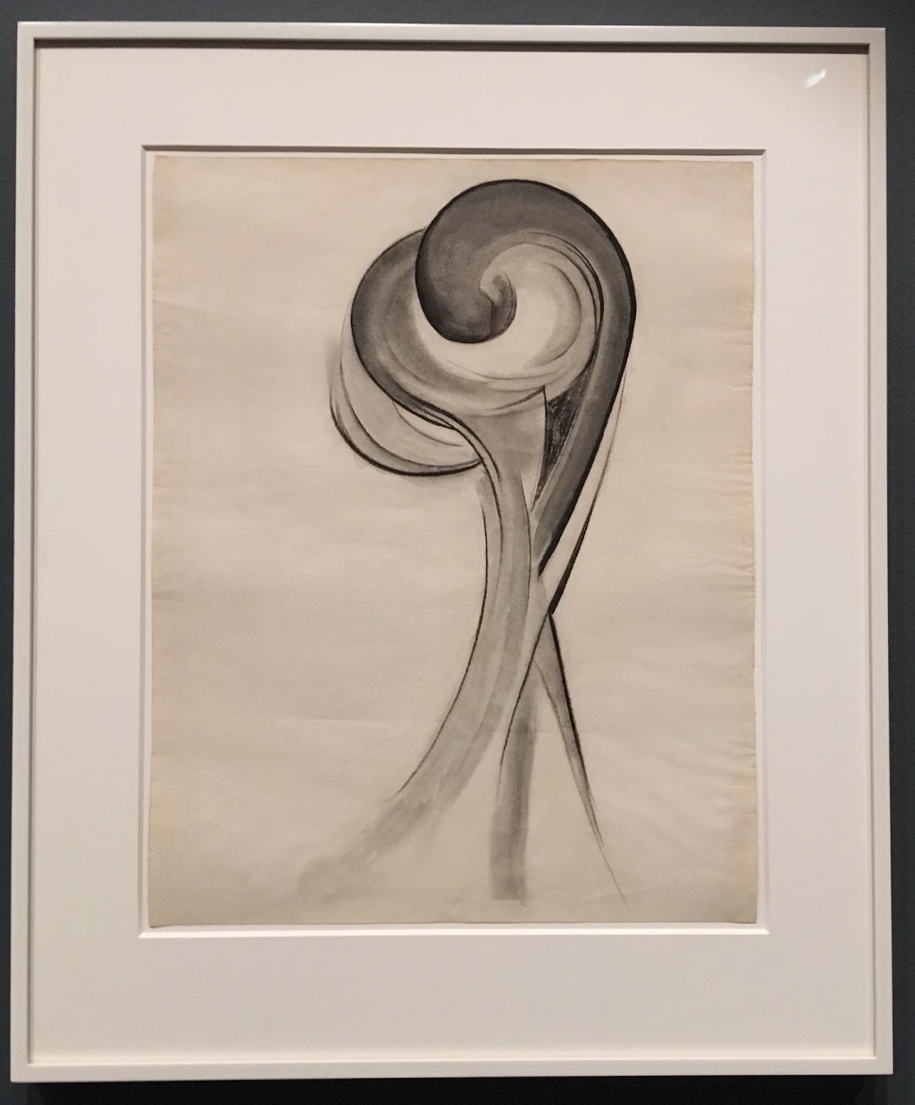 The charcoal on paper above is from an early period in her career when she had gone back to basics working just in black and white. The curves where an image she played with in a lot of these pieces the play of light and shade strong lines and soft lines with that beautiful curve really appealed to me. Later in the exhibition it is echoed in a charcoal piece Rams Horns from a later time of her life when she was working with skulls and bones.